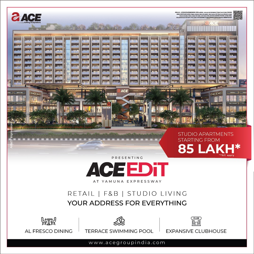 ACE Edit is a modern space that blends premium retail outlets and smart studio apartments to create a lively yet comfortable lifestyle. Designed for today’s generation, it offers spacious high street shops with a height of 14 feet on the first floor, ensuring better visibility and a grand look.